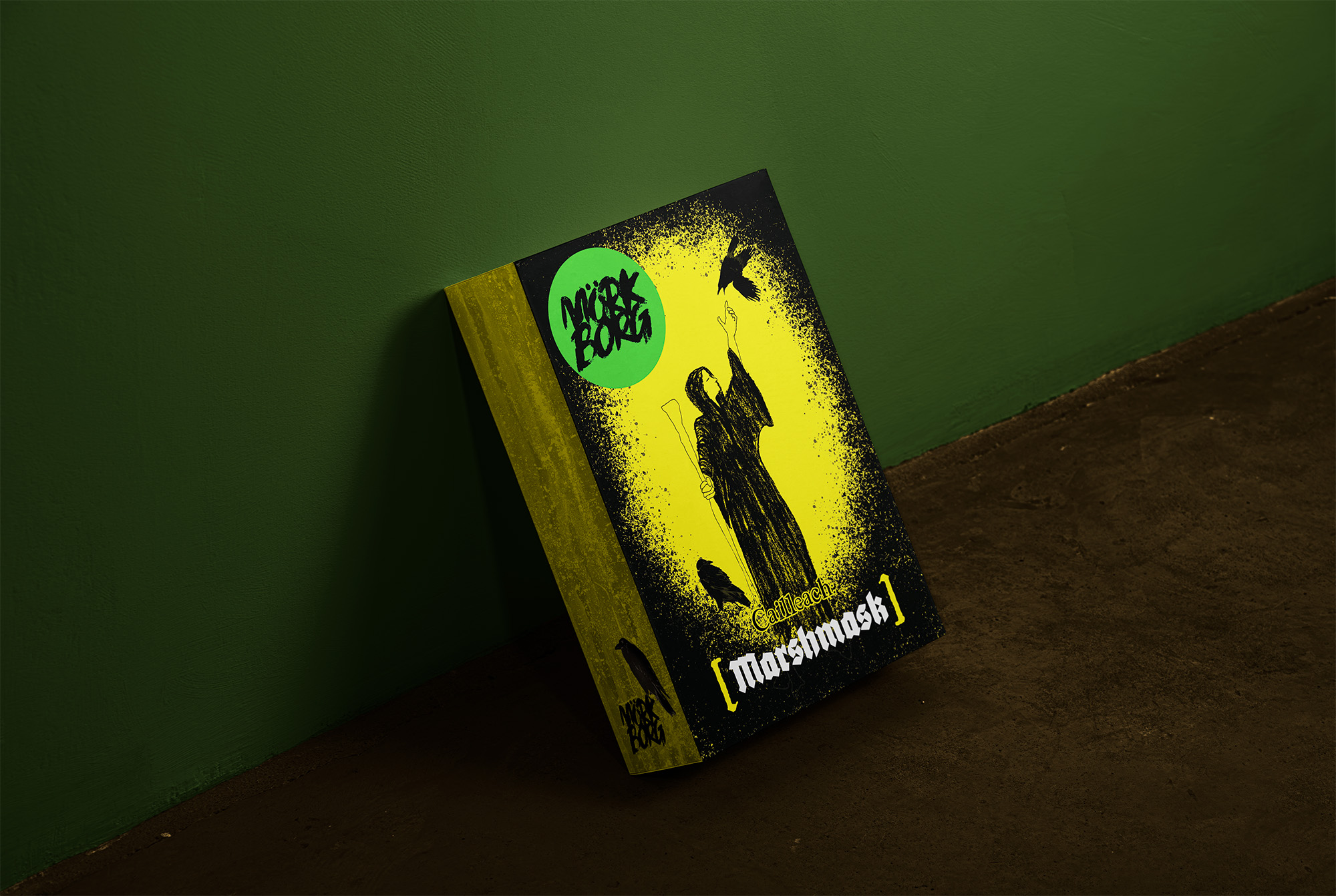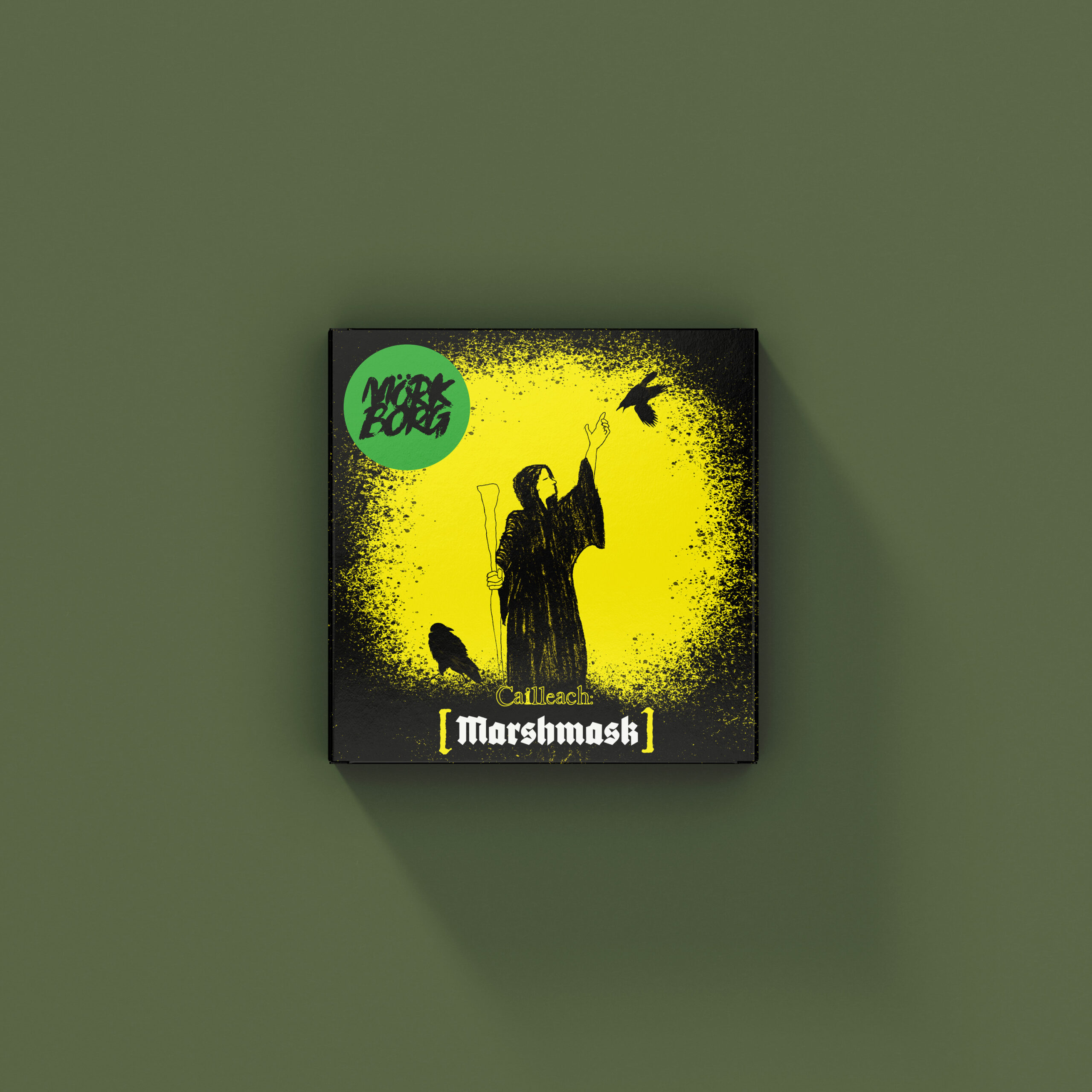 Mork Borg is an apocalyptic fantasy RPG, which encourages players to create homebrew versions and their own original content. I created my own character, a Cailleach called Marshmask, and designed some packaging to contain her miniature.